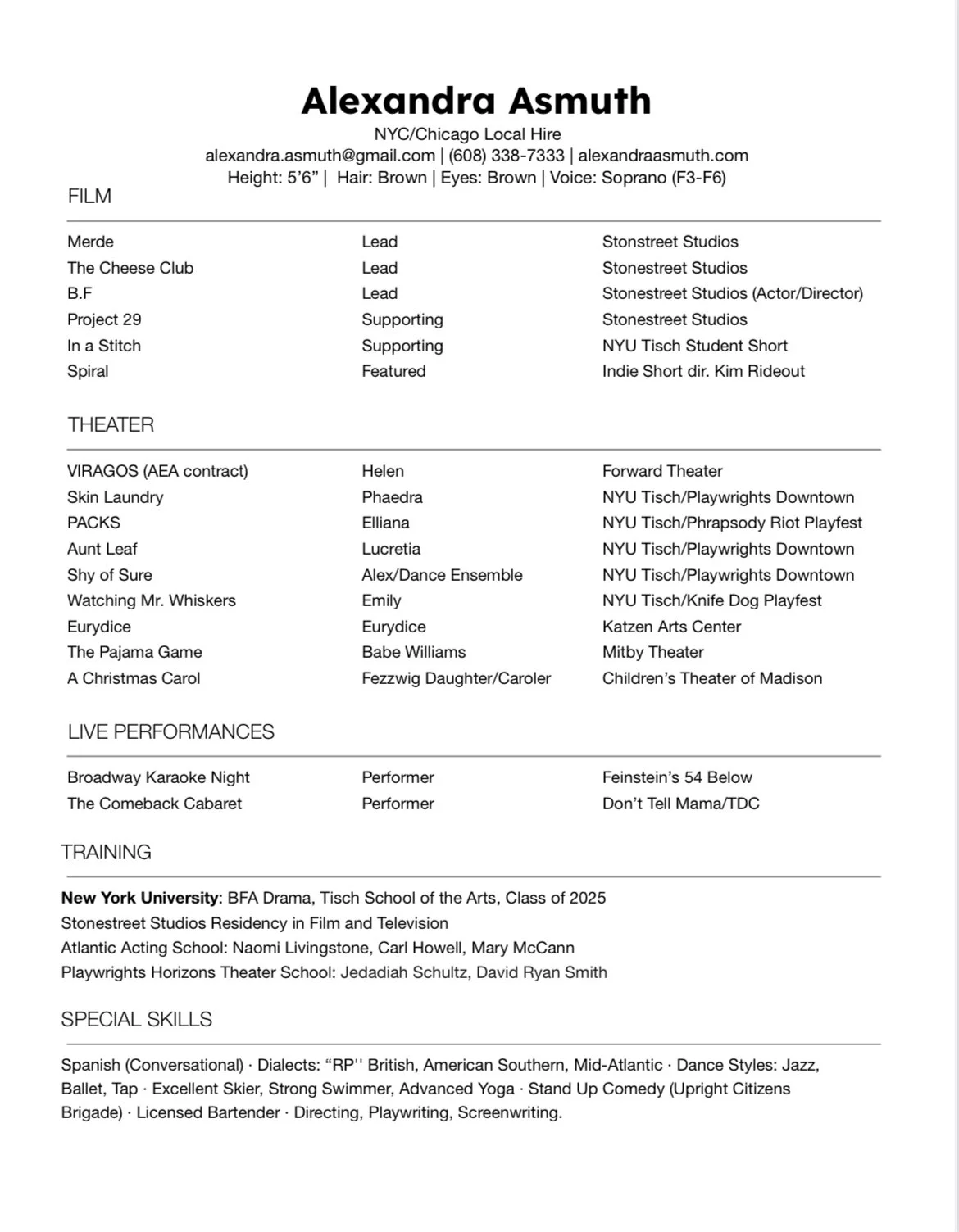 Hi there! I’m Alexandra, but my friends call me Alex. I’m originally from Madison, Wisconsin, so I have a midwestern charm that’s met with a global mindset and a constant desire to learn. Stories have always made me feel connected to something bigger than myself, so when I started voice lessons at 6 years old, something just clicked: I wanted to be a storyteller. Growing up I found community and purpose through performing (including, as pictured, my “star turn” in my 4th grade musical). I found I could use my deep emotional well to tell stories that matter, and my wit, or my own folly, to make people laugh without even trying.